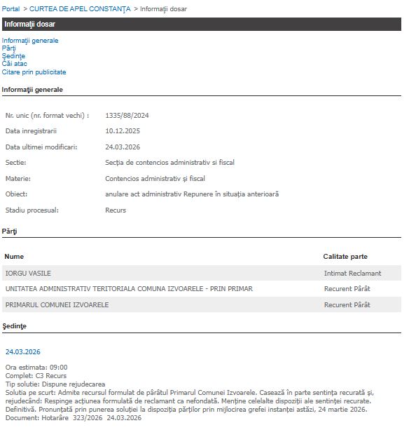 La data de 9 martie 2026, este programat primul termen în dosarul nr. 1335/88/2024 aflat pe rolul Curții de Apel Constanța, în care UAT Comuna Izvoarele - prin primar și Primarul comunei Izvoarele au declarat recurs împotriva deciziei Tribunalului Tulcea prin care instanța a admis în parte acțiunea formulată de Iorgu Vasile privind eliminarea sa din echipa de implementare a proiectelor finanțate din fonduri europene nerambursabile, inclusiv PNRR.