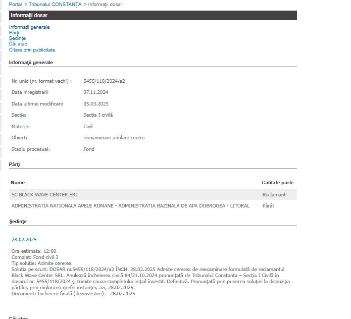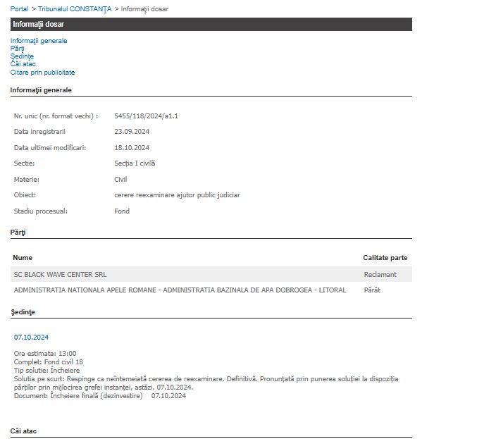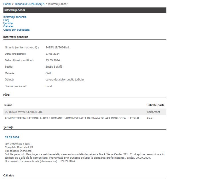 Dosarul, înregistrat inițial în august 2024, a întâmpinat dificultăți încă de la început. Cererea reclamantei a fost inițial anulată de instanță în octombrie 2024, iar solicitările de ajutor public judiciar au fost respinse. Totuși, prin perseverență juridică, Black Wave Center SRL a reușit în februarie 2025 să obțină anularea încheierii de respingere și retrimiterea cauzei spre judecare pe fond.
