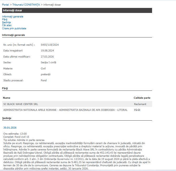 La data de 30 ianuarie 2026, Secția I Civilă a Tribunalului Constanța a tranșat disputa, respingând excepțiile invocate de ABADL (inadmisibilitatea și prescripția):