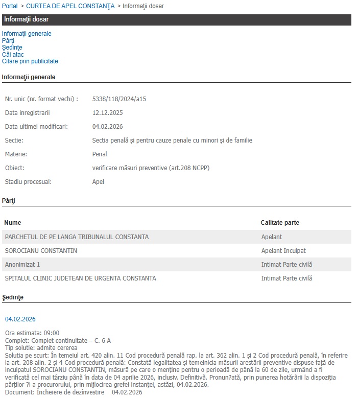 Între timp, la data de 12.02.2026, la Curtea de Apel Constanța va avea loc ședința de judecată, în faza apelului.