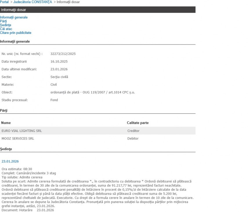 - Judecătoria Constanța a admis astăzi, 23 ianuarie 2026, cererea formulată de creditorul Euro Vial Lighting SRL în contradictoriu cu debitorul Mooz Services SRL, care a fost chemat în instanță pentru ordonanță de plată