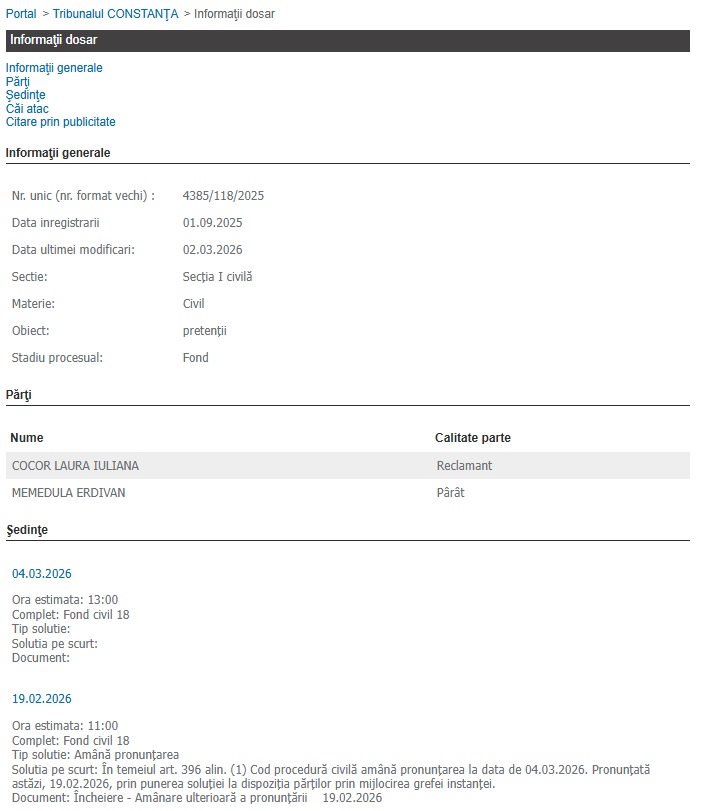 De asemenea, Laura Iuliana Cocor așteaptă și soluția într-un alt dosar deschis pe Secția I Civilă, în care l-a chemat în judecată pe afaceristul Memedula Erdivan, care are ca obiect pretenții.