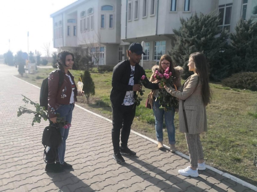 Fotbaliștii de la FC Viitorul au oferit flori doamnelor și domnișoarelor de la Universitatea Ovidius din Constanța