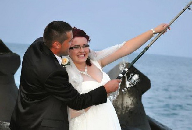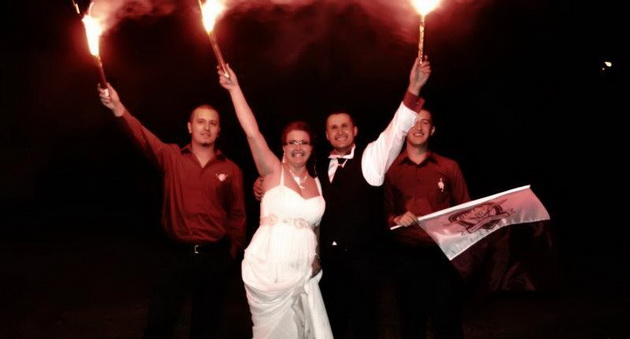 Naşii, Teodor şi Oana Butacu (şi ei din Tuzla, dar care sunt actualmente în Suedia), le-au adus tinerilor însurăţei, la local (Complexul Crişana din Eforie Sud), steaguri ale Rapidului. De asemenea, alţi doi fani constănţeni ai Rapidului au venit cu fumigene, ei şi soţii Proca aprinzându-le afară şi cântând. La poze, Cristian şi Carmen au mers şi la mare, la stabilopozi, unde au dat simbolic la peşte, cu o lansetă. Fotograful profesionist Marius Grosu a surprins aceste instantanee, lui aparţinându-i şi mai multe dintre imaginile ataşate articolului de faţă. Mirii s-au fotografiat la pescuit nu întâmplător, explicaţia lor fiind: „Nu e peşte ca guvidul şi echipă ca Rapidul!“