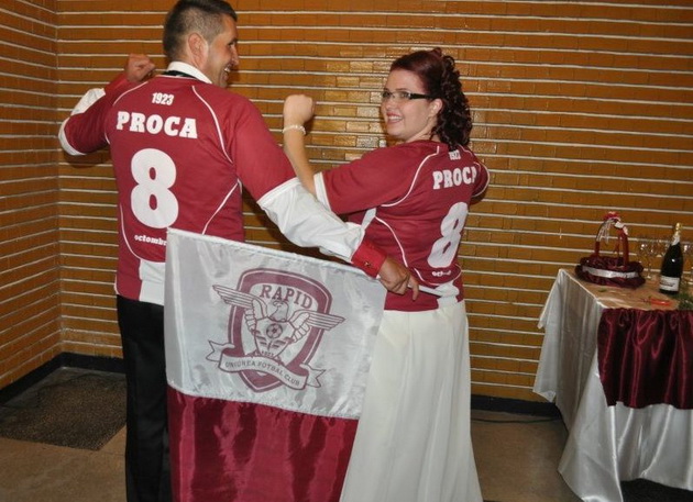 În familia Proca, din localitatea constănţeană Tuzla, dragostea pentru echipa de fotbal Rapid Bucureşti este a doua religie. Carmen şi Cristian sunt suporteri dedicaţi şi inclusiv la nunta lor, iar apoi, la botezul fetiţei, au arătat cât de mult iubesc gruparea giuleşteană.Cristian are 35 de ani, iar soţia sa, 25. „Suntem împreună de o viaţă“, spune Carmen, fixând anul 2006 ca punct de pornire al unei relaţii care s-a menţinut de atunci plină de fericire. Tânăra este chiar din Tuzla, în vreme ce Cristian s-a născut la Câmpulung, în judeţul Argeş, venind pe litoral în urmă cu vreo zece ani, la Eforie, cu serviciul. Cei doi s-au cunoscut pe Internet. „Avem un prieten comun şi am început să dialogăm pe net. Apoi am prins curaj şi ne-am întâlnit“, dezvăluie Carmen. Pe lângă dragostea sa, Cristian i-a transmis lui Carmen şi sentimentele alese faţă de Rapid. Bărbatul, care era şi fotbalist, iubea nebuneşte gruparea din Grant şi aşa a devenit şi Carmen. Un fan înfocat. De unde, până să-l cunoască pe Cristi, nu avea treabă cu fotbalul, iar cu Rapidul nici atât, după aceea, inima a început să-i bată după ritmul tobelor galeriei giuleştene.