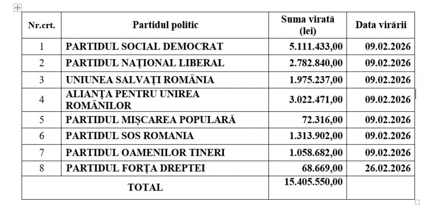Care este suma virată de AEP către partidele politice în ianuarie 2026