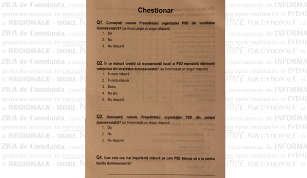 Odată cu scrutinul intern organizat ieri la nivel naţional pentru desemnarea viitorului preşedinte al PSD, social-democraţii au demarat şi un sondaj de opinie. Sute de mii de chestionare au fost distribuite în întreaga ţară pentru a fi completate de membrii de partid, de simpatizanţi ai PSD, dar şi de simpli cetăţeni.