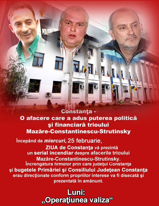 Începând de miercuri, 25 februarie, ZIUA de Constanţa vă prezintă un serial incendiar despre afacerile trioului Mazăre-Constantinescu-Strutinsky. Încrengătura firmelor prin care judeţul Constanţa şi bugetele Primăriei şi Consiliului Judeţean Constanţa erau direcţionate conform propriilor interese va fi disecată şi prezentată în amănunt.Materialul va putea fi citit în categoria INVESTIGAŢII.