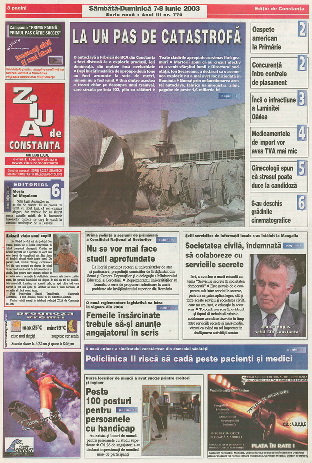 Din arhiva cotidianului ZIUA de Constanţa, vă prezentăm astăzi trei materiale din ediţia nr. 770 din data de 7/8 iunie 2003.