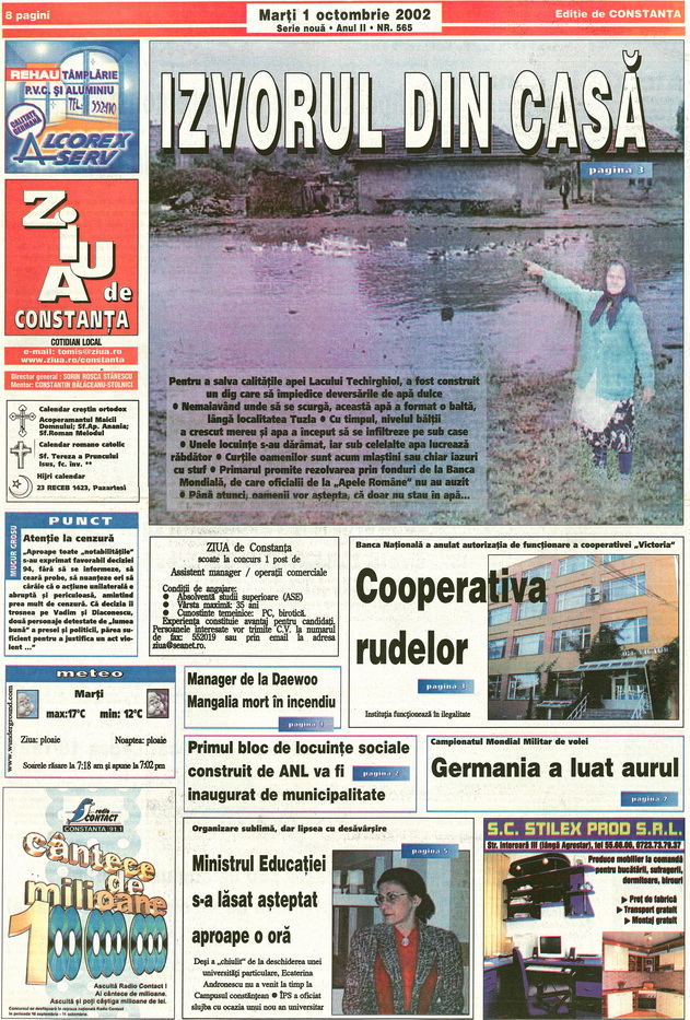 Din arhiva cotidianului ZIUA de Constanţa, vă prezentam astăzi trei materiale din ediţia nr. 565 din data de 1 octombrie 2002.