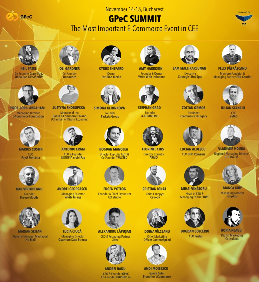 Mai mult de 30 de speakeri internaţionali şi români sunt anunţaţi anul acesta la GPeC Summit - cel mai important eveniment de E-Commerce şi Marketing Online care se va desfăşura la Bucureşti, în zilele de 14 şi 15 noiembrie. Printre speakerii internaţionali de referinţă se numără Neil Patel (Co-fondator Crazy Egg, Hello Bar şi Kiss Metrics), Oli Gardner (Co-fondator Unbounce), Sam Mallikarjunan (Executive Strategist HubSpot), Amy Harrison (Fondator Write With Influence) şi Cyrus Shepard (Owner Fazillion Media).