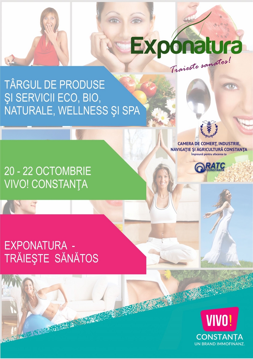Camera de Comerţ, Industrie, Navigaţie şi Agricultură (CCINA) Constanţa organizează, în perioada 20 - 22 octombrie, Târgul de Produse şi servicii eco, bio, naturale, wellness şi spa, denumit „Exponatura - Trăieşte Sănătos“, ajuns la cea de-a V-a ediţie.Târgul va avea loc la centrul comercial VIVO! Constanţa şi va aduce în atenţia publicului constănţean o alternativă la modul actual de viaţă, evidenţiind importanţa şi beneficiile unei vieţi sănătoase şi soluţiile pentru care constănţenii pot opta, prin promovarea producătorilor de produse ecologice, bio, naturale şi a serviciilor wellness şi spa.