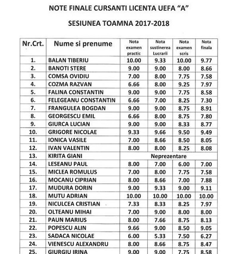 Licenţa UEFA „A“ le dă dreptul deţinătorilor să antreneze ca principali la Liga a 3-a şi a 2-a şi ca secunzi la Liga 1. După această licenţă, urmează licenţa Pro, cu care se poate antrena ca principal o formaţie de prim eşalon din România. În fotografie, Constantin Fălină este al doilea din stânga în rândul de sus, iar Stere Banoti al doilea din stânga în rândul din mijloc.Sursa foto: 1 - Facebook (Leşeanu Junior); 2 - Facebook (Adrian Mutu)