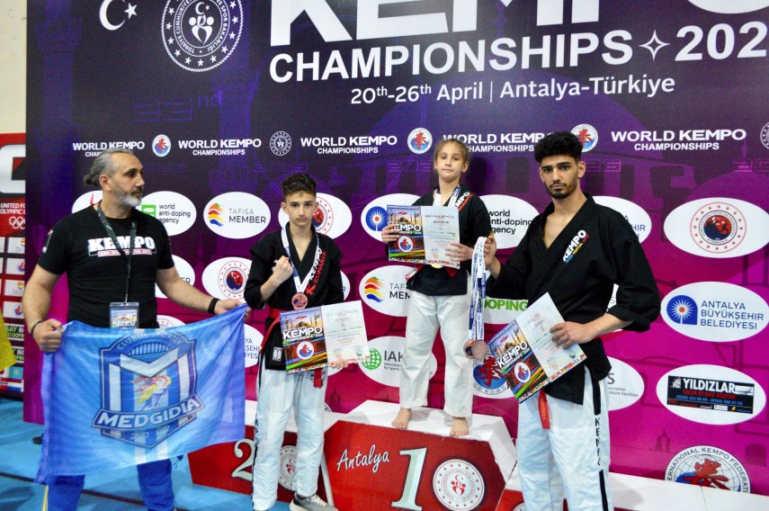 Frații luptători Crînguș (Eric, Patrick și Dominik), membri de frunte ai secției de Kempo de la CS Medgidia, unde sunt antrenați de tatăl lor, Ionel Crînguș, au avut o evoluție reușită și la Campionatul Mondial de Kempo IKF din Antalya (Turcia), obținând cinci medalii (una de aur, una de argint și trei de bronz)!