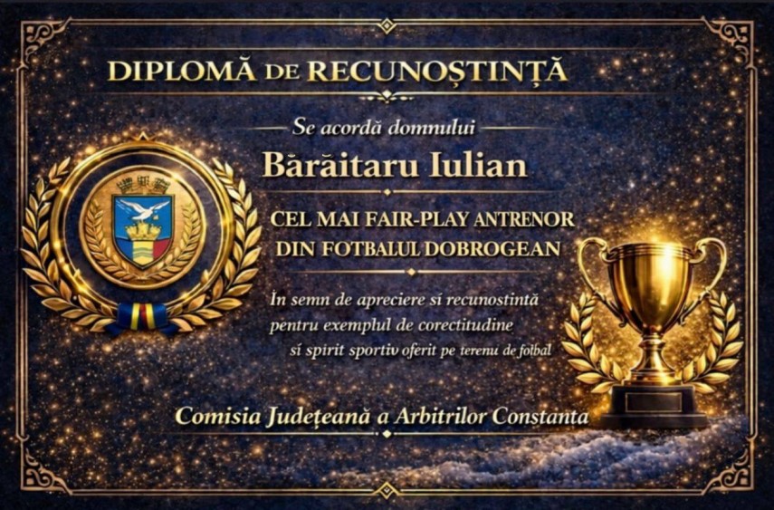 CSO Murfatlar: Antrenorul Iulian Bărăitaru, distincție primită din partea Comisiei Județene de Arbitri Constanța