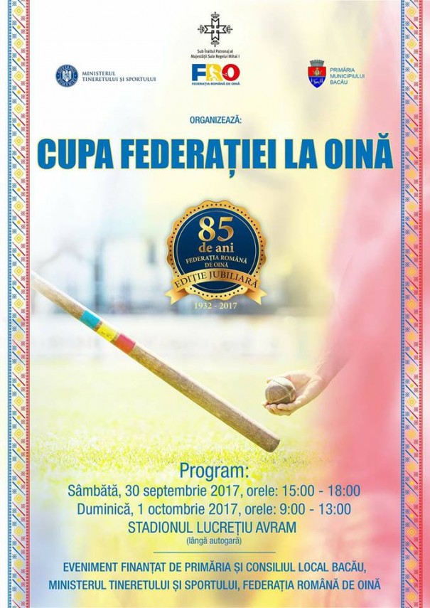 Cupa Federaţiei la Oină, competiție ce va avea loc sâmbătă și duminică la Bacău, va închide sezonul pe iarbă în sportul nostru național. Competitia,organizata de Federatia Romana de Oina, Primaria Municipiului Bacau si Ministerul Tineretului si Sportului, in colaborare cu Directia Judeteana pentru Sport si Tineret Bacau si Inspectoratul Scolar Judetean Bacau ,se va derula dupa urmatorul program:-sambata 30 septembrie:-ora 14.00- sedinta tehnica