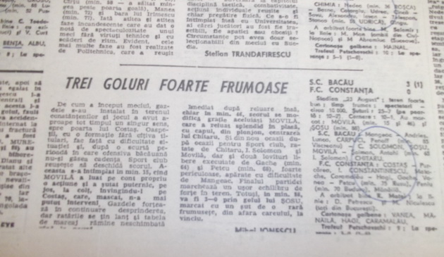 Foştii săi colegi de acum aproape 32 de ani vorbesc de un talent precoce, care avea să explodeze în scurt timp. Echipa lui FC Constanţa din acel meci a fost: Costaş - V. Purcărea, I. Constantinescu, Matache, Caramalău - V. Mănăilă, Gache, Vanea, Hagi - Peniu (70 Buduru), Şt. Petcu (75 Rusu). Ca antrenor principal activa Emanoil Haşoti. Gazdele s-au impus cu 3-0 (Movilă 15, 46, Şoşu 88), formaţia lor fiind: Mangeac - Andrieş, Lunca, Cărpuci, Penoff (85 Viscreanu) - C. Solomon, Şoşu, Movilă, Şoiman - Antohi (65 I. Solomon), Chitaru. După această înfrângere, echipa constănţeană se afla în clasament pe locul 16 (din 18 echipe), cu numai trei puncte, înregistrând o victorie, un egal şi patru înfrângeri, golaveraj 7-19. La finalul acelui sezon, FC Constanţa avea să retrogradeze în Divizia B, după ce s-a clasat pe ultimul loc, cu 20 de puncte (şapte victorii, şase egaluri şi 21 de înfrângeri, 30-65 golaveraj). Cele două fotografii de colecţie de mai sus sunt preluate de pe Pagina de Facebook ale lui Gică Hagi. În prima este surprinsă o fază dintr-un meci susţinut pe teren propriu de FC Constanţa, în vreme ce, în cea de-a doua, „marinarii” joacă în deplasare.„L-am încurajat să-şi facă jocul“