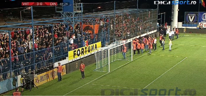 După 18 minute în care jocul nu s-a reluat, arbitrul Marcel Bârsan a chemat ambele echipe la maginea terenului, iar în peluză a început evacuarea fanilor dinamoviști.