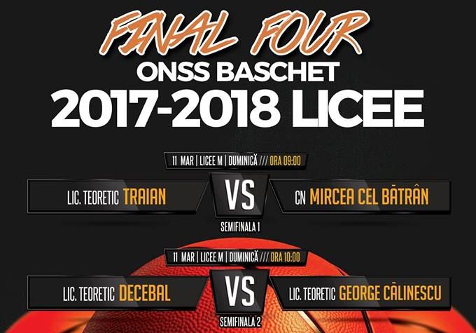 Complexul Sportiv „Tomis“ din Constanţa găzduieşte, duminică, 11 martie, Turneul Final Four la baschet licee al Olimpiadei Naţionale a Sportului Şcolar, ediţia 2017/2018.Programul este următorul: