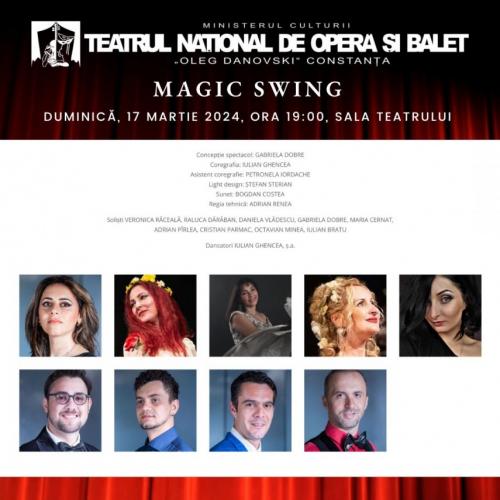 Teatrul Naţional de Operă şi Balet „Oleg Danovski“ a ieşit la rampă cu un spectacol atractiv, care abia te ţine pe scaun, „Magic Swing“, un show plin de vervă în care toată lumea dansează şi vibrează cu muzica retro a anilor '30, '40, '50, '60. Bună dispoziţie, multă culoare, strălucire, dinamism şi muzică bună. Acestea sunt atributele cele mai elocvente ale acestui spectacol pus în scenă de Gabriela Dobre, cu o coregrafie de Iulian Ghencea, asistent de coregrafie fiind Petronela Iordache.„Este vorba despre puterea magică a muzicii de a ne transporta în timp, mai exact în timpuri mai romantice decât cele pe care le trăim în prezent. Cum muzica este cea care adaugă forţă cuvintelor uneori prea sărace, dansul este cel care creează poezie fără vorbe, iar împreună alcătuiesc formula magică a sentimentelor dincolo de vreme. Restul este foarte limpede şi concis explicat în filmuleţul de prezentare. Melodiile sunt retro, din anii '30, '40, '50, '60, evergreen-uri care transcend temporalitatea, care au însufleţit generaţiile trecute şi îşi păstrează şi azi valoarea şi frumuseţea“, descrie Gabriela Dobre spectacolul „Magic Swing“.