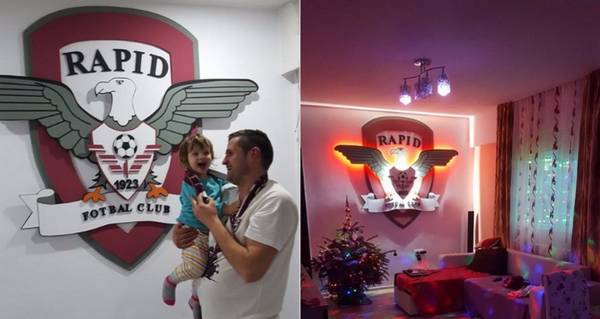 Cristian şi-a împlinit unul dintre visuri, acela de a avea mereu sub ochi, în casă, o siglă mare a Rapidului. Mare cât inima sa alb-vişinie! Având în vedere că a decis să transforme încăperea în care funcţionase un magazin într-un living, Cristi a trecut la treabă şi a făcut şi sigla. „Îmi doream de mult aşa ceva. Mi-a dictat sufletul. S-au folosit mai multe materiale. Formele mari sunt din rigips, iar literele (dintr-un plastic special), le-am făcut la un centru specializat de la Constanţa. Am folosit şi autocolant, am vopsit cu lavabil, iar prinderea pe perete s-a făcut cu silicon şi dibluri (îngropate şi gletuite frumos). Am beneficiat de sprijinul unui rigipsar renumit din Tuzla, Marius Stoian, prieten de-al meu. El a făcut partea de rigips, iar apoi de tot ce ţine de litere, de vopsit, de şlefuit şi de aranjat, m-am ocupat eu. Am făcut 3D, pe mai multe plăci, nu pe o singură placă. S-au folosit vreo trei plăci de rigips“, a declarat Cristian Proca. Vulturul de pe stemă are 1,90 m lăţime şi 0,75 m înălţime.