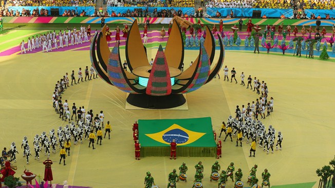 Ceremonia de deschidere a durat 25 de minute și a fost urmărită de peste un miliard de telespectatori din 200 de ţări. Cu câteva ore înainte de startul festivităților, la Sao Paulo au izbucnit violențe, poliția militară intervenind pentru a dispersa grupuri de manifestanți care protestau împotriva desfășurării Campionatului Mondial. Spectacolul de deschidere a Cupei Mondiale a fost împărțit în patru acte, evocându-se frumusețea și diversitatea Braziliei, iar naturii, oamenilor și fotbalului aducându-li-se omagii. Pentru fiecare minut al festivităţii au fost necesare 200 de ore de repetiţii. Un bărbat paralizat a lovit mingea oficială a Cupei Mondiale, fiind ajutat de un schelet electronic. Piesa de rezistență a spectacolului a fost o minge „vie”, formată din 90.000 de leduri. Imnul oficial al Campionatului Mondial, „We Are One”, a fost interpretat de cântăreţii Pitbull, Jennifer Lopez, Claudia Leitte şi formaţia de toboşari Olodum, care au efectuat apoi un tur de onoare.Neymar, omul meciului