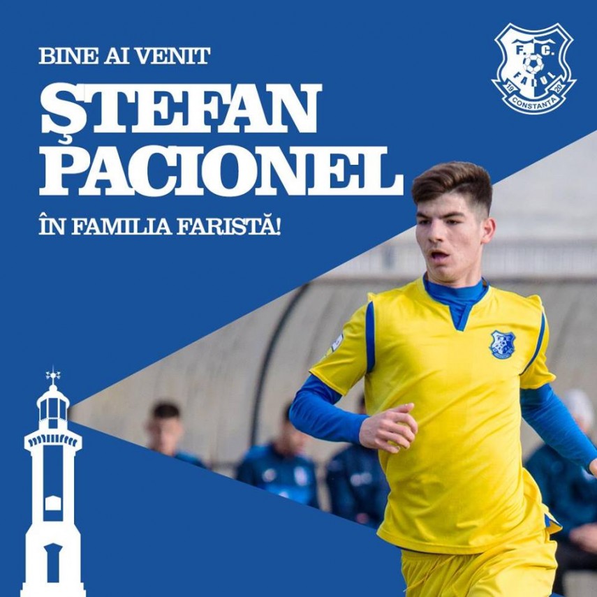 Echipa de fotbal de Liga a 2-a SSC Farul Constanța a anunțat astăzi un nou transfer, Ștefan Pacionel (mijlocaș, 19 ani), care vine de la FCSB II, dar a început fotbalul la Craiova.