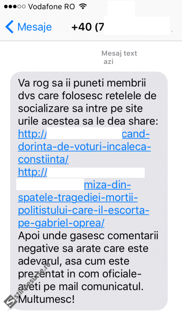Iată mesajul tip SMS primit în cursul după-amiezii de ieri de șefii UNPR de la centru: