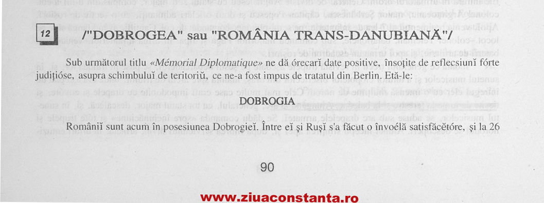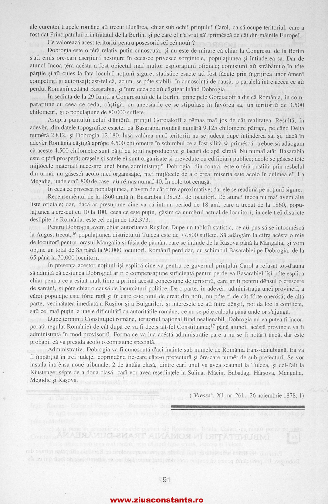 26 noiembrie 1878. Revista „Mémorial Diplomatique“ face o prezentare generală a Dobrogei. Este prezentată, în primul rând, ca o ţară, cunoscută sub numele de „România trans-danubiană“, care va fi împărţită în trei judeţe, având o populaţie de 90.000 de locuitori.Din Stoica Lascu, „Mărturii de epocă privind istoria Dobrogei”, 1999, pag. 90-91