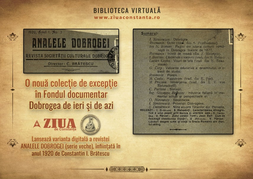 Cotidianul ZIUA de Constanţa şi-a depăşit statutul publicistic, angajându-se într-un amplu demers de restituire a istoriei Dobrogei şi a personalităţilor sale marcante. În Biblioteca Virtuală ZIUA de Constanţa, puteţi să descărcaţi în format electronic revista „Analele Dobrogei“ - serie veche, izvor de aur pentru cunoaşterea istoriei locale.