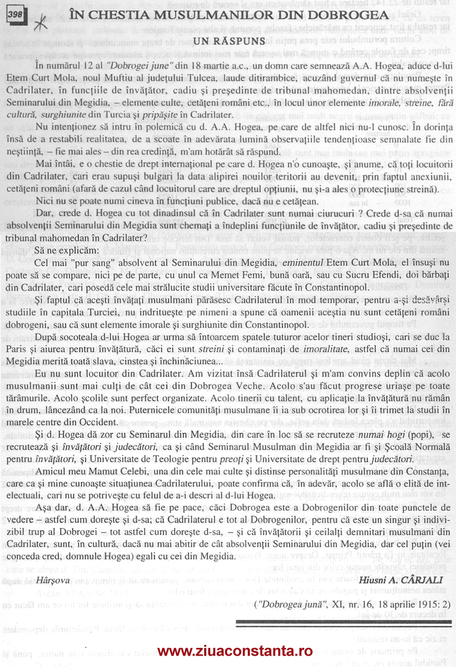 18 aprilie 1915. Polemică între reprezentanţi ai intelectualilor musulmani în chestiunea repartizării absolvenţilor Seminarului musulman din Medgidia: „Eu nu sunt locuitor din Cadrilater. Am vizitat însă Cadrilaterul şi m-am convins pe deplin că acolo musulmanii sunt mai mulţi decât cei din Dobrogea Veche“.Din Stoica Lascu, „Mărturii de epocă privind istoria Dobrogei“, 1999, pag. 710-711