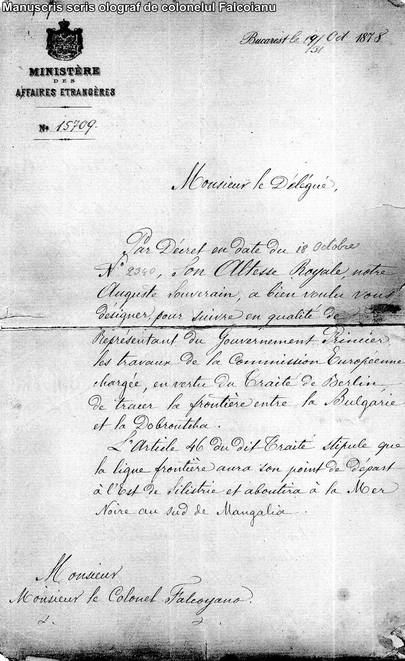 Prin decretul din 18 octombrie, Nr. 2340, Alteţa Sa Regală, Augustul nostru Suveran, a binevoit să vă desemneze pentru a urma, în calitate de Reprezentant al Primului Guvern, lucrările Comisiei Europene însărcinată, în virtutea Tratatului de la Berlin cu trasarea graniţelor între Bulgaria şi Dobrogea.