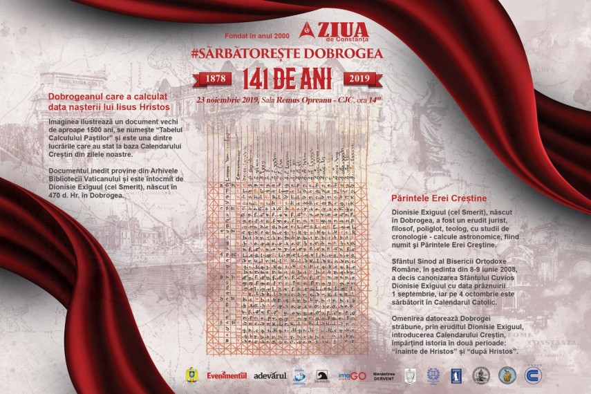 ZIUA de Constanţa #sărbătoreşteDobrogea141, sub semnul lui Dionisie Exiguul „Ziua Dobrogei“, la a treia ediţie, cu o temă în premieră - „Dobrogea în documente diplomatice româneşti. 1878-1884“