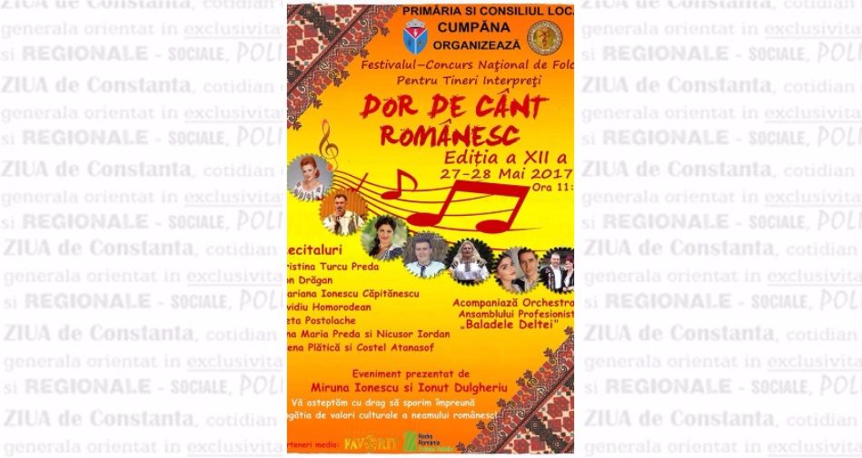 Unul dintre cele mai aşteptate evenimente culturale organizate la Cumpăna este Festivalul-concurs naţional de folclor pentru tineri interpreţi din întreaga ţară „Dor de cânt românesc“, ajuns în acest an la cea de-a XII-a ediţie. Acesta este dedicat doar artiştilor amatori, solişti vocali din toate colţurile ţării, interpreţi ai cântecului popular românesc cu vârste cuprinse între şase şi 18 ani, şi se desfăşoară în perioada 27-28 mai. Ca de fiecare dată, manifestarea va fi găzduită de Casa de Cultură din comună.Competiţia se va desfăşura pe 27 mai, cu începere de la ora 11.00, iar gala laureaţilor şi festivitatea de premiere sunt programate pentru a doua zi, începând cu ora 12.00. „Acest festival-concurs este expresia împlinirii unei datorii sacre pentru valorificarea unui gen artistic peren, păstrat la loc de cinste în sufletul fiecăruia dintre noi. Ne dorim şi sperăm ca şi această ediţie să constituie o reuniune artistică de excepţie, o sărbătoare prin cântec şi pentru cântec a românilor de pretutindeni“, a afirmat primarul comunei Cumpăna, Mariana Gâju.