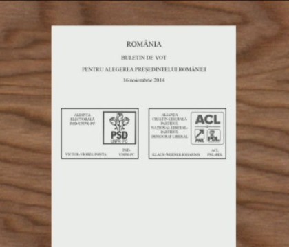 Biroul Electoral Central a stabilit modelul buletinului de vot pentru alegerile din 16 noiembrie.Numele celor doi candidaţi, Victor Ponta şi Klaus Iohannis, se regăsesc pe aceeaşi pagină, în ordinea stabilită după votul din primul tur. Astfel, de la stânga la dreapta , pe prima poziţie este inscripţionat numele candidatului PSD, urmat de cel al ACL.