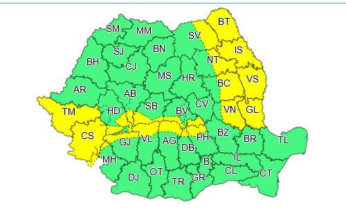 - În Banat, zona Carpaților Meridionali și Moldova sunt sub cod galben de vânt puternic, respectiv polei.