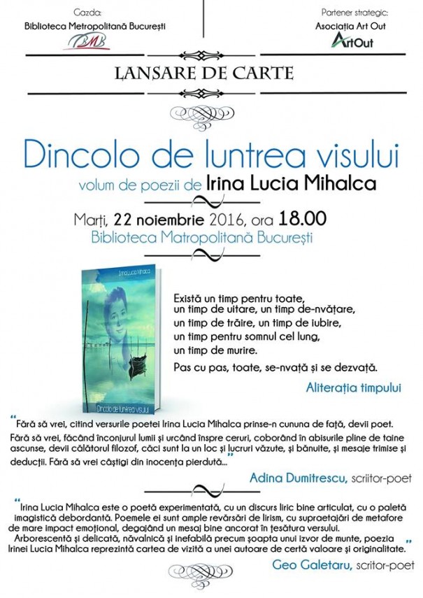 Marți, 22 noiembrie 2016, începând cu ora 18.00, publicul este invitat la lansarea și sesiunea de autografe a volumului de poezii, «Dincolo de luntra visului» a scriitoarei Irina Lucia Mihalca. Evenimentul va fi găzduit de Biblioteca Metropolitană București (str. Tache Ionescu, nr. 4) va cuprinde cuvinte ale autorului, ale invitaților speciali, recitări, momente artistice. Alături de personalităti ale vieții cultural-artistice, vor fi prezenți scriitori, poeți, prieteni și apropiați. Volumul a fost editat la Editura Musatinia, Roman, sub îngrijirea editorului Emilia Țuțuianu, datorită colaborării îndelungate în decursul timpului cu Revista Musatinia și, totodată, datorită meleagurilor natale, Piatra Neamț. Cuvântul înainte a fost scris de scriitoarea și poeta Adina Daniela Dumitrescu.