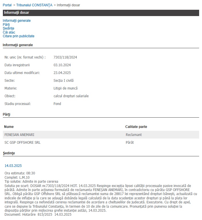- Dosarul cu indicativul 1858/118/2024, în care Tribunalul a dat câștig de cauză lui Cutu Stere, căruia GSP Offshore are de achitat salarii restante din perioada 01.11.2023-08.03.2024 şi contravaloarea a 463 ore suplimentare (stoc ore dana), în cuantum de 20.371 lei și 3.000 lei cu titlu de cheltuieli judiciare (onorariu avocat).